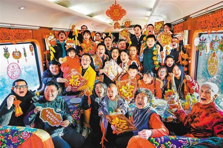 在辽宁沈阳市至广东广州市的Z12次列车上,旅客和列车组工作人员欢乐互动。