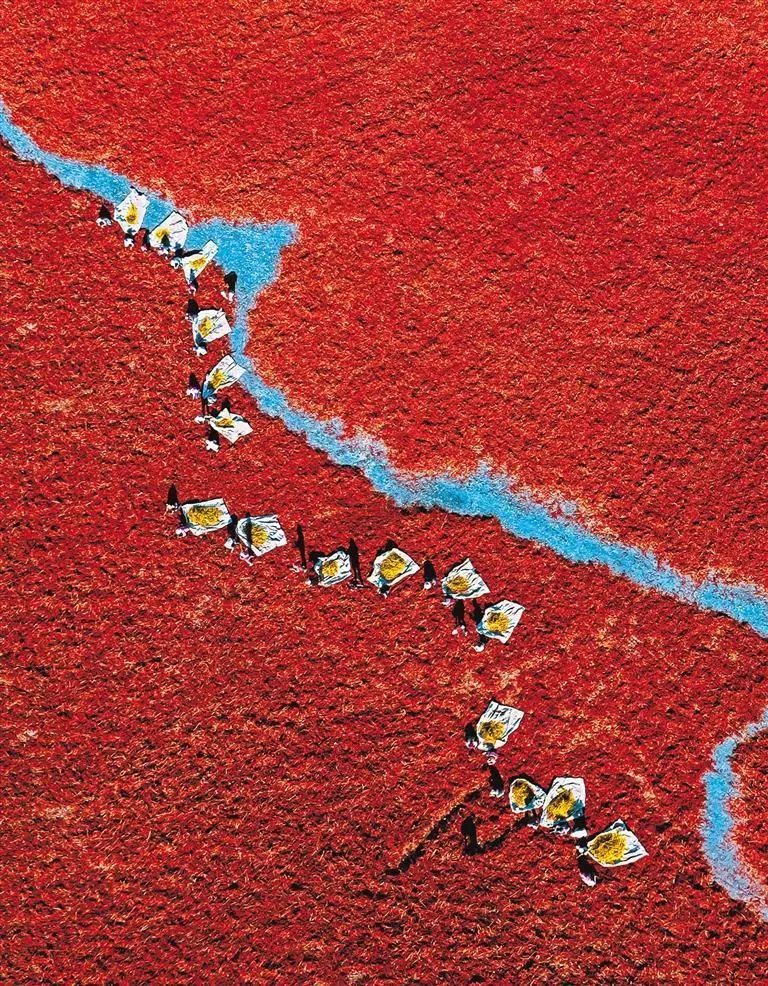新疆塔城地区博尔通古牧场,农民在晾晒辣椒。