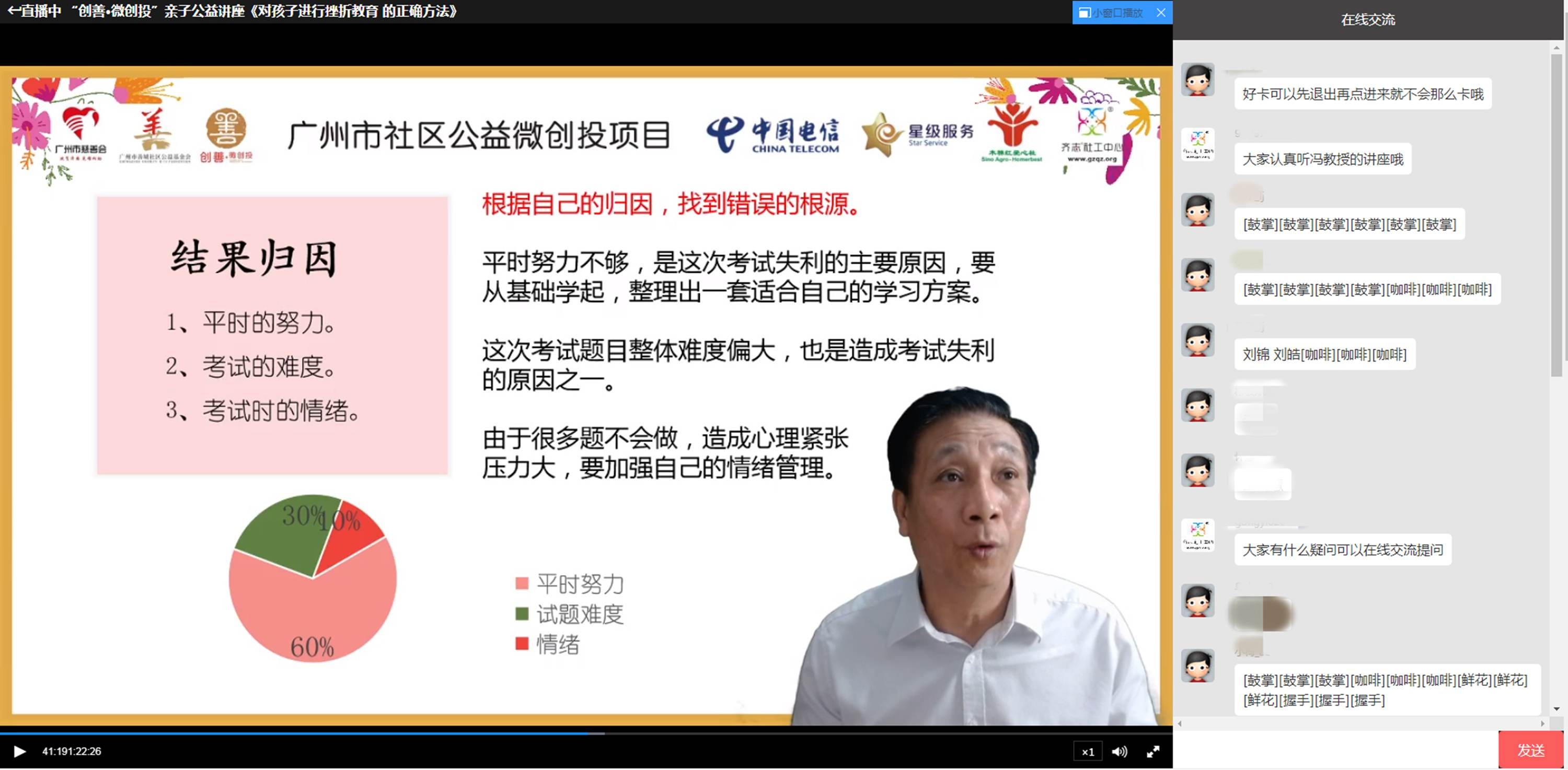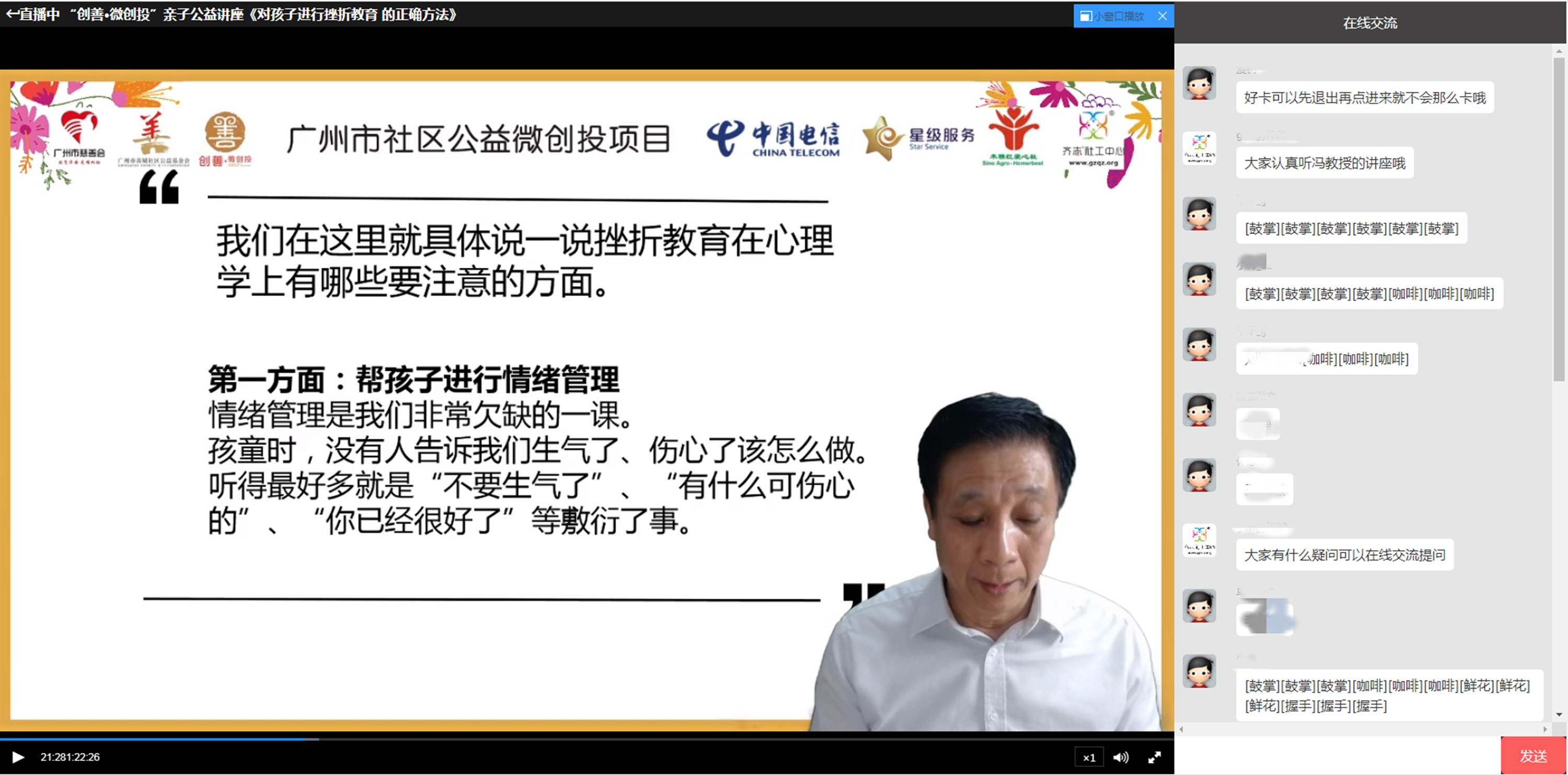 1月23日周六下午,受疫情影响,由广州电信天翼俱乐部与广州市越秀区齐志社会工作服务中心联合主办的“为困境儿童筑梦成长”第三期亲子沟通公益讲座采用线上直播的方式开展。本项目获得“创善·微创投”广州市社区公益微创投项目资助,还得到广东中农企业总公司、广州汇美思工艺品有限公司、木棉红爱心社的支持,本次课程由中国儿童心理研究会专家冯德泉教授主讲。本次讲座有24名孩子和21名家长以及2名志愿者参加。