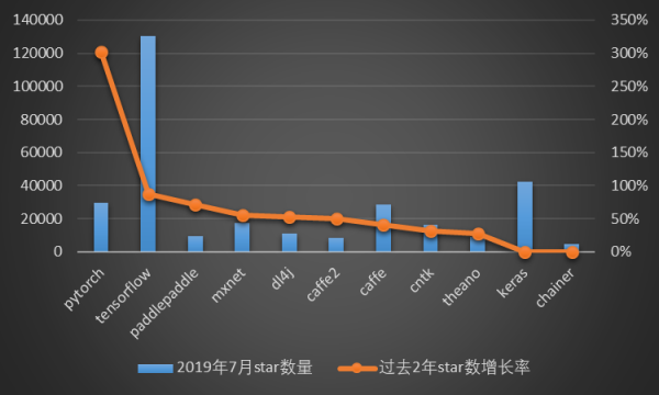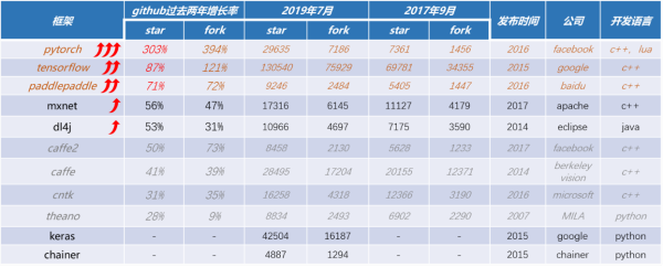 再来看一下GitHub对应的一些数据情况,Pytorch,TensorFlow,PaddlePaddle过去两年保持了较快的发展速度,尤其是Pytorch的星数增长了3倍,获得了颇多关注。而Caffe&Caffe2,Theano,CNTK等,虽然已经停止迭代,但得益于产业的快速发展,GitHub星数仍有一定增长。