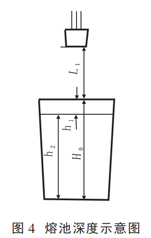 鞍钢 200 t 铁水罐出铁量为 190~205 t, 出铁 量不同,铁水罐耐材的侵蚀程度不同,熔池深度也 不同, 原设计模型的熔池深度是通过铁水量的变 化理论计算得出, 没有考虑铁水罐耐材侵蚀造成 的铁水罐容变大, 必须准确测量铁水熔池深度才 能准确计算出下桨深度。图 4 为熔池深度示意图。