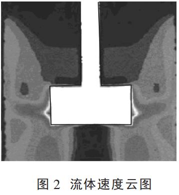 图 2 为流体速度云图。搅拌桨两侧灰色部分是铁水流动的高速区, 搅拌桨桨叶上部区域和搅拌桨下部黑色区域是铁水流动的低速区域, 同时在搅拌桨边缘靠近铁水罐边缘部分形成湍流,是脱硫剂混匀的最佳区域。只有保证铁水高速区域灰色部分面积最大, 搅拌桨下部铁水流动速度最小的黑色区域(通常认为是死区)面积最小,脱硫剂才能达到最佳的混匀效果。在脱硫剂稳定的条件下,工业试验以脱硫效率最高、脱硫粉剂消耗最低、搅拌桨底部结瘤最小时为最佳浸入深度。