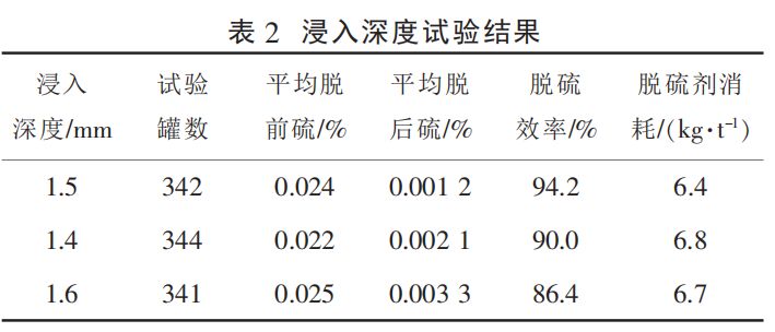试验了 1.4、1.5、1.6 m 三个浸入深度。每个搅 拌桨从上线开始直至报废下线, 统计脱硫效率和 脱硫剂消耗。浸入深度试验结果见表 2。