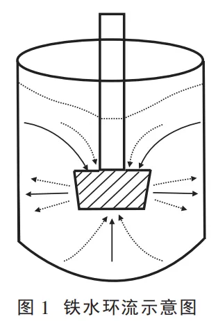 浸入深度(搅拌桨下沿距铁水液面的高度)影 响脱硫剂的混匀效果,影响脱后成分的均匀性,研 究浸入深度必须研究 KR 脱硫的铁水流场。铁水 环流示意图见图 1。
