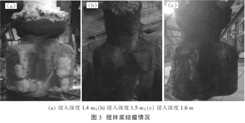 由表 2 看出,浸入深度为 1.5 m 时,脱硫效率最高,为 94.2%,脱硫剂消耗最低,为 6.4 kg/t。三个 浸入深度的搅拌桨结瘤情况见图 3。由图 3 看出, 浸入深度为 1.4 m 时搅拌桨结瘤最严重,1.6 m 时 次之,1.5 m 时搅拌桨基本上不结瘤。