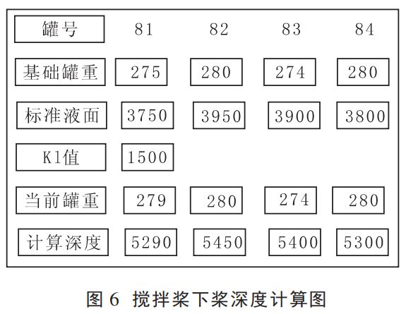 (3) 搅拌桨抬起, 测量搅拌桨浸入铁水的深 度, 搅拌桨从待机位到搅拌桨下沿接触铁水的实 际数码等于搅拌桨浸入铁水里时的数码减去搅拌 桨浸入深度。这个数码称为本罐铁水的液面高度。然后在计算机一级程序上做出搅拌桨下桨深度计 算图,见图 6。把对应罐号的铁水量输入就可以得 出下桨深度,再根据脱硫的操作画面,则整个搅拌 桨的浸入深度模型编制完成。