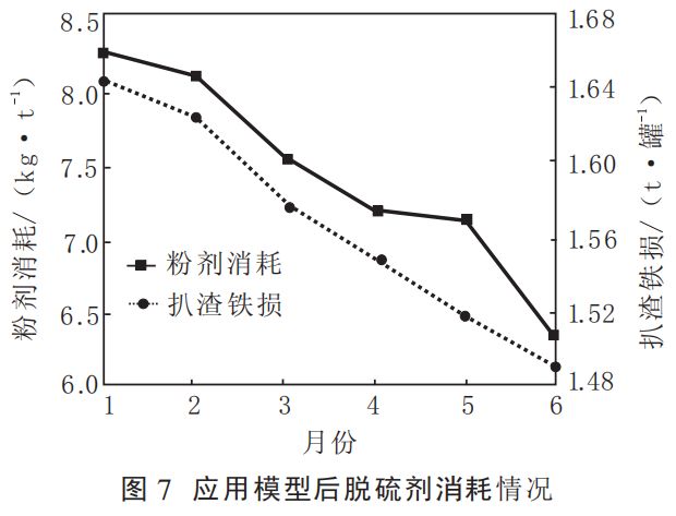 2018 年 1 月应用了该模型, 应用新模型既解 决搅拌桨结瘤问题,又从根本上杜绝了浸入深度过 浅造成铁水喷溅导致的铁水损失。1~6 月份脱硫 剂的消耗情况及扒渣铁损情况见图 7。从图 7 中可 以看出,脱硫剂消耗持续降低,从 1 月份的吨铁最 高消耗 8.286 kg 降到 6 月份的 6.340 kg,降幅达到 23%。扒渣铁损降低了 0.16 t/罐, 降低幅度接近 10%。此期间工况相同,分析扒渣铁损降低的原因 认为, 一部分是粉剂消耗降低, 按脱硫渣含铁量10%计算,粉剂消耗降低 23%,由此带来扒损降低 应该是 23%×10%=2.3%,所以,减轻铁水喷溅降低 了 7.7%的扒渣铁损。
