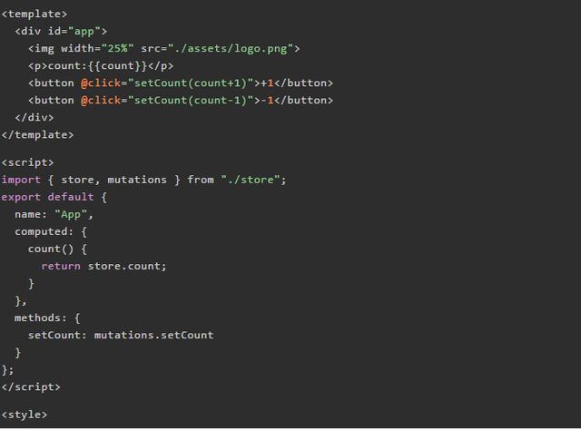 如下这个例子,我们将在组件外创建一个 store,然后在 App.vue组件里面使用 store.js 提供的 store和 mutation方法,同理其它组件也可以这样使用,从而实现多个组件共享数据状态。