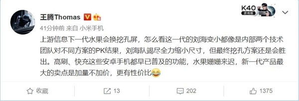 原标题:iPhone 13刘海变小iPhone 14要用挖孔屏 王腾:最终挖孔屏会胜出