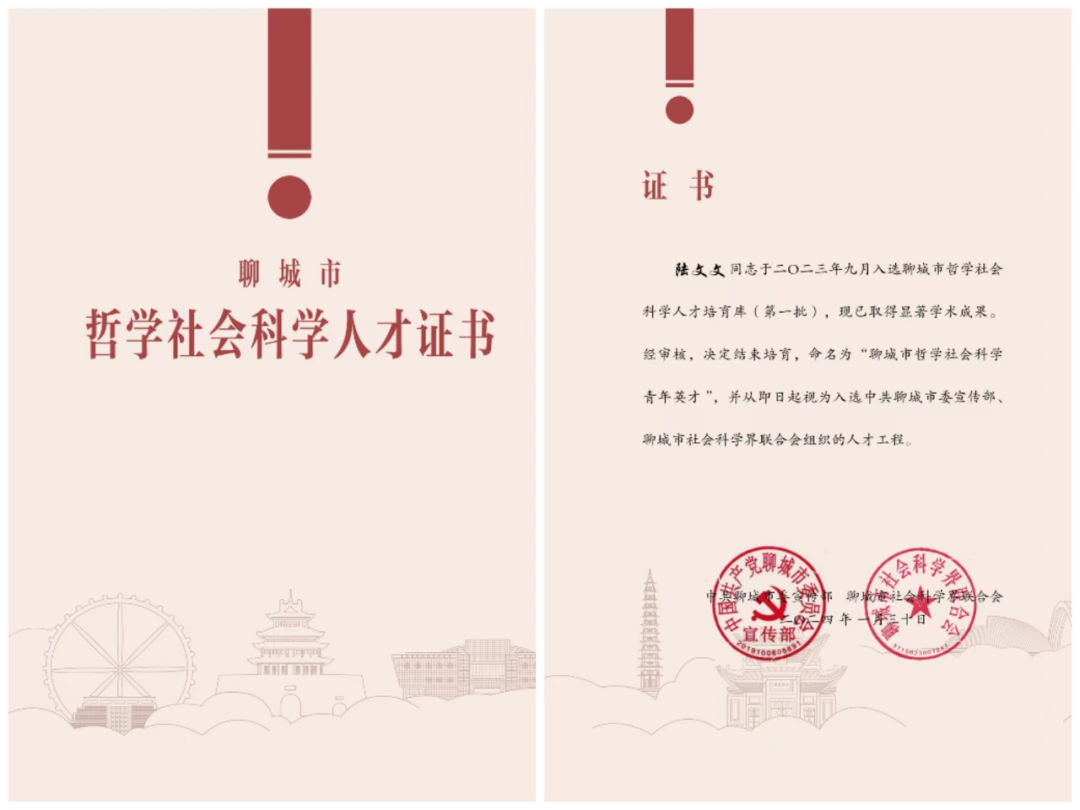 会上,聊城市社科联党组成员、副主席王文首先向聊城市哲学社会科学人才培育库成员陆文文颁发了聊城市哲学社会科学人才证书。2023年11月,陆文文入选第四批羡林学者青年计划培育对象,达到结束培育的条件,根据市委宣传部、市社科联《聊城市哲学社会科学人才培育库实施细则》,命名为“聊城市哲学社会科学青年英才”。