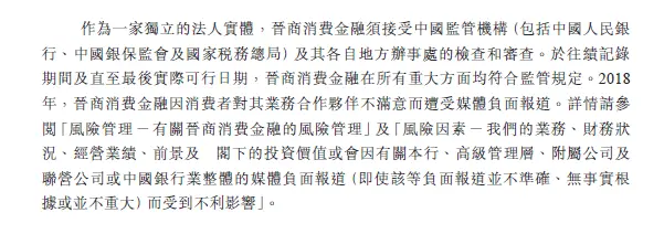与此前披露的招股书相比较,聆讯资料集中晋商银行补充表示“于往季记录期间及直至最后实际可行日期,晋商消费金融在所有重大方面均符合监管规定。2018年,晋商消费金融因消费者对其业务合作伙伴不满意而遭受媒体负面报道。”