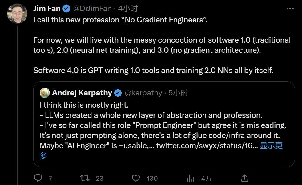 在讨论中,也有人提出了「认知工程师」、「AI 系统工程师」等名称作为候选,英伟达 AI 科学家 Jim Fan 认为这种新兴的职业应该被称为「无梯度工程师」—— 从传统工具 1.0,到神经网络 2.0,再到无梯度架构的 3.0,我们终于等来了 GPT 系列自我训练的 4.0 版本。