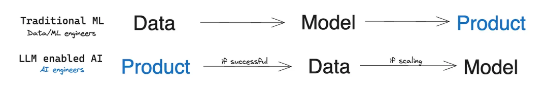 假设后者(数据、ML 工程师)的数量是前者(AI 工程师)的 100 到 1000 倍,而通过与 LLM 交互的工作方式会让你比传统的机器学习快 10 到 100 倍。因此,AI 工程师将能够以比以往便宜 10000 倍的方式验证 AI 产品。