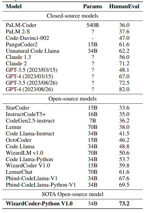 因此,WizardCoder-Python-34B-V1.0 成为了最新的 SOTA 开源代码大模型。