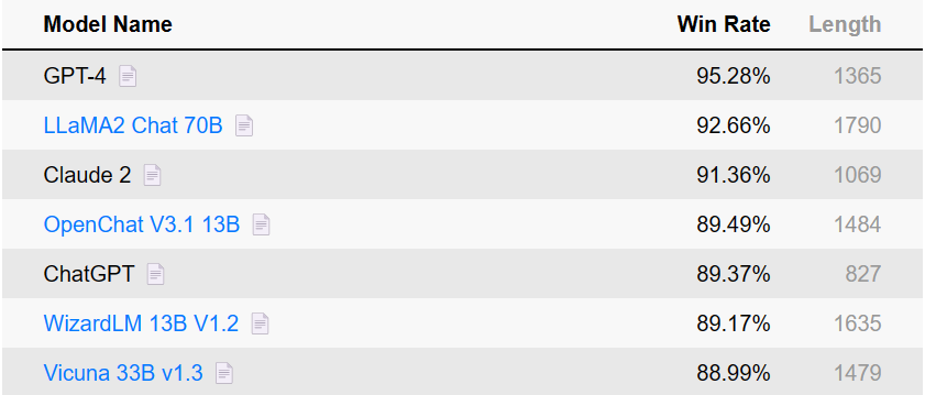 斯坦福发布的大语言模型排行榜 AlpacaEval 是一种基于 LLM 的全自动评估基准,且更加快速和可靠。很多著名的模型如 GPT-4、ChatGPT 等都在其上刷榜单。在这其中,WizardLM 13B V1.2 依旧在第六位。