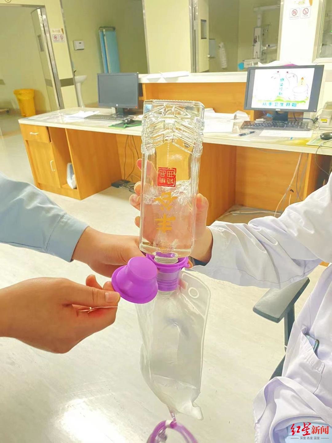 ▲将真白酒倒入胃肠营养袋,通过鼻饲管为患者泵注