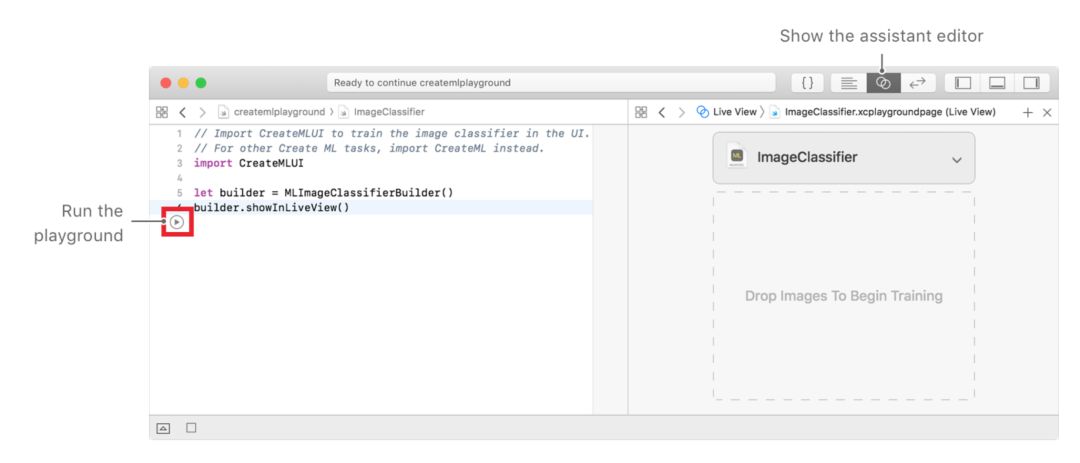 如下我们将简要展示如何使用 Create ML 创建图像分类应用。简单而言,我们希望给定分类器一些图像的,然后它会输出图像的具体类别。当然首先我们需要准备一些训练样本,包括图像与对应标注。然后在 Xcode 试验场中创建一个 MLImageClassifierBuilder 实例,并以实时的方式查看: