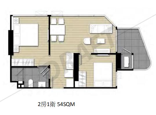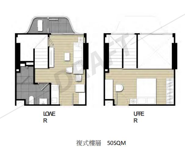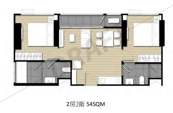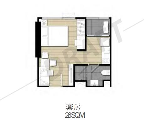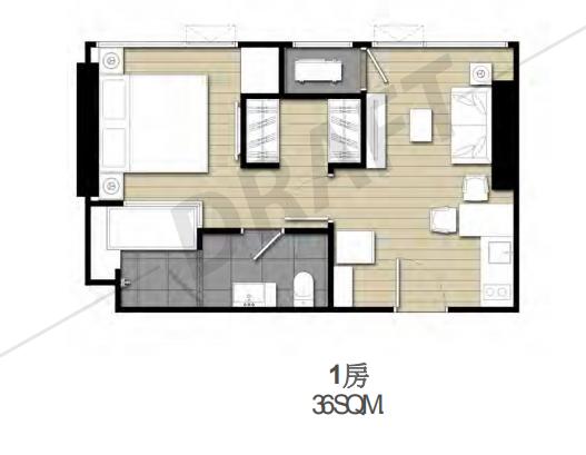 项目共有5种不同户型,包括26平方米的套房、36平方米的一房、54平方米的两房一厅、54平方米的两房两厅以及50平方米的复式房型。