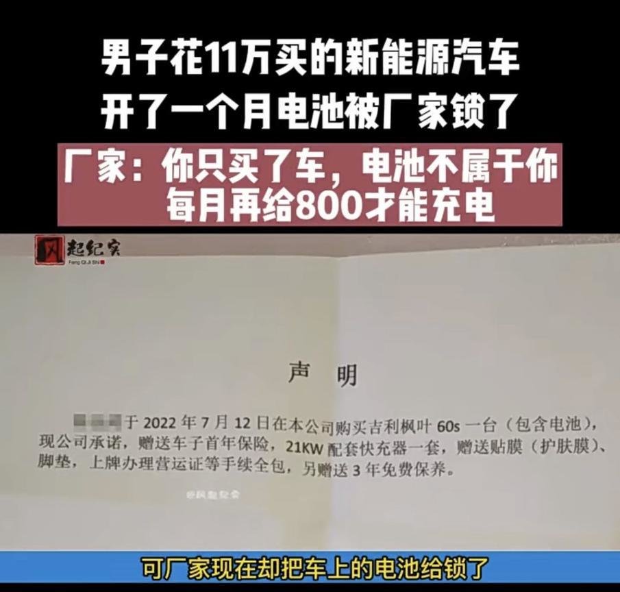 先说一件,王先生花了11万买了一辆吉利枫叶60s,是一款纯电汽车,一个月后,电池被锁,没有动力,汽车就变成了一堆“废铁”,王先生大喊不公平,车商对此也是振振有词,到底是谁吃了亏,咱把事情摆开了分析一下。