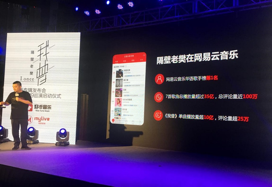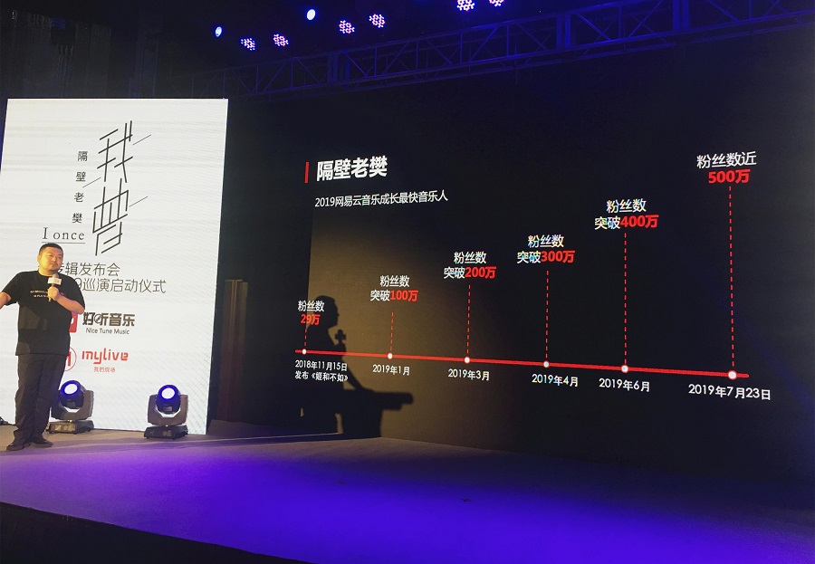 网易云音乐是《我曾》专辑的线上独家首发平台。专辑中的7首单曲此前也已在平台陆续发布。网易云音乐原创音乐部高级总监赵宗在现场介绍,目前隔壁老樊已位居网易云音乐华语歌手榜第一名,是2019年音乐市场最大黑马,也是2019年网易云音乐平台成长最快的音乐人。网易云音乐通过头部资源位强势曝光,个性化推荐精准分发,运营活动多维度助推等不同方式,帮助更多用户发现和分享隔壁老樊的优质作品。
