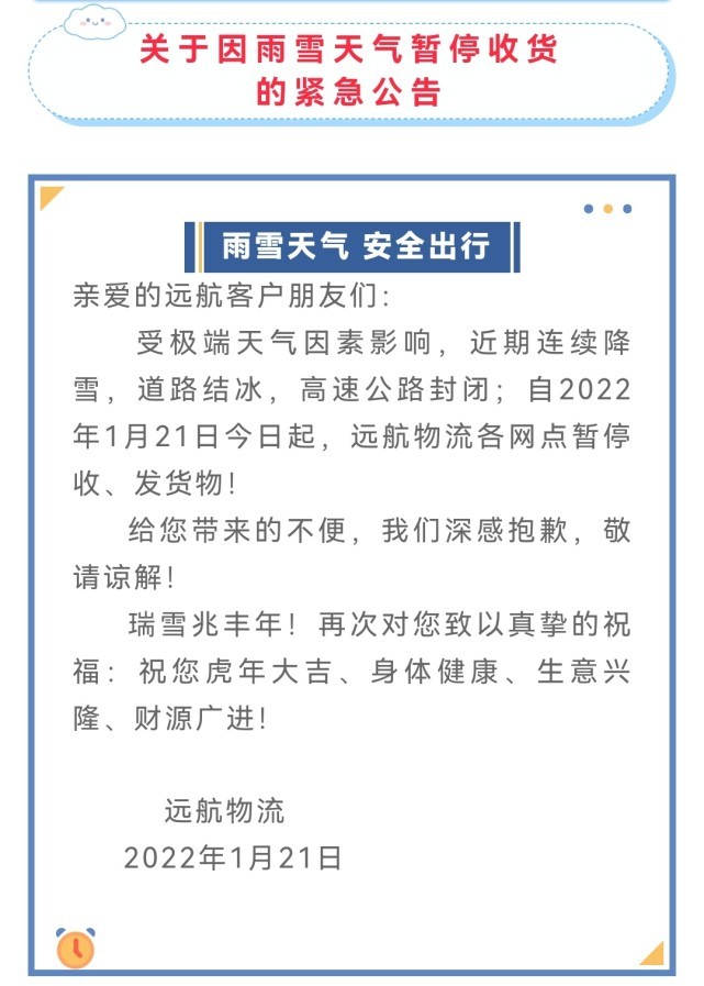 受极端天气因素影响,近期连续降雪,道路结冰,高速公路封闭;自2022年1月21日起,远航物流各网点暂停收、发货物。