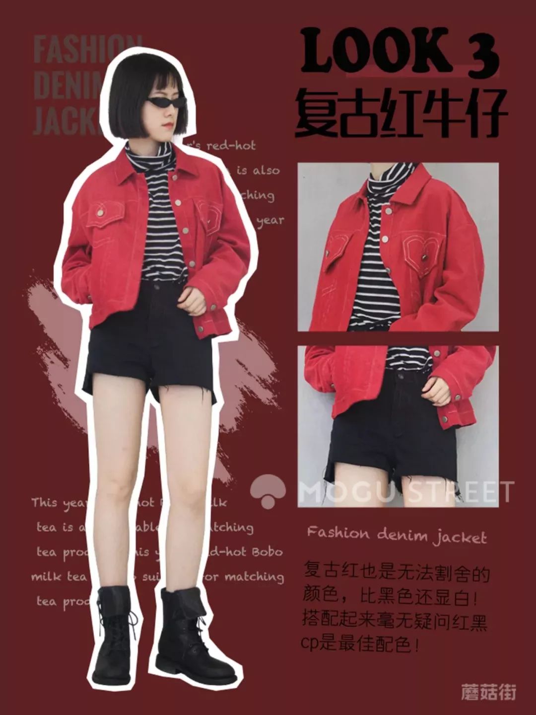 复古感满满的红色牛仔外套也是无法割舍的爱呀!显白功力一流,简单的红黑配就能超级出彩啦~