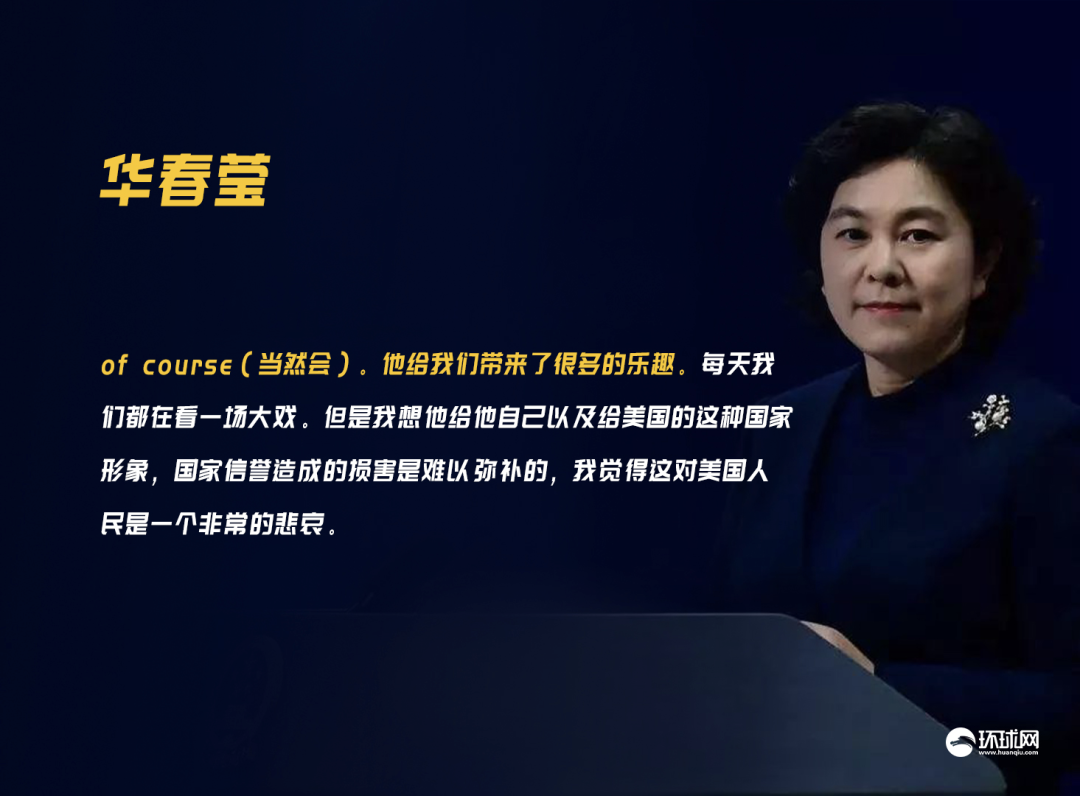 对此,发言人华春莹称,of course(当然会)。他给我们带来了很多的乐趣。每天我们都在看一场大戏。但是我想他给他自己以及给美国的这种国家形象,国家信誉造成的损害是难以弥补的,我觉得这对美国人民是一个非常的悲哀。