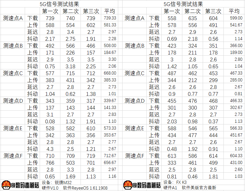 在每个测试点都测试三遍以保证数据准确性。对比设备为之前WiFi5的所谓天花板机型FX K3,可以看得出,除了在测速点D网速差一些以外,其余测速点均要高过K3(上传、延迟和抖动请忽略,测K3的时候比较早,是双条内存;测M32的时候是单条内存)。