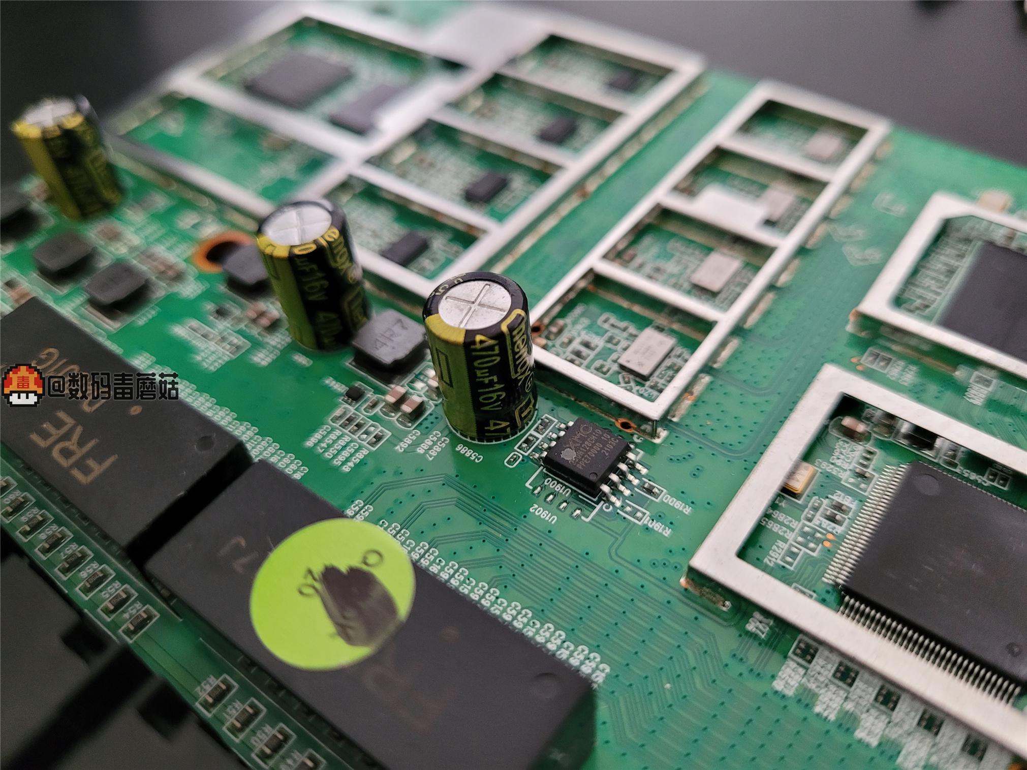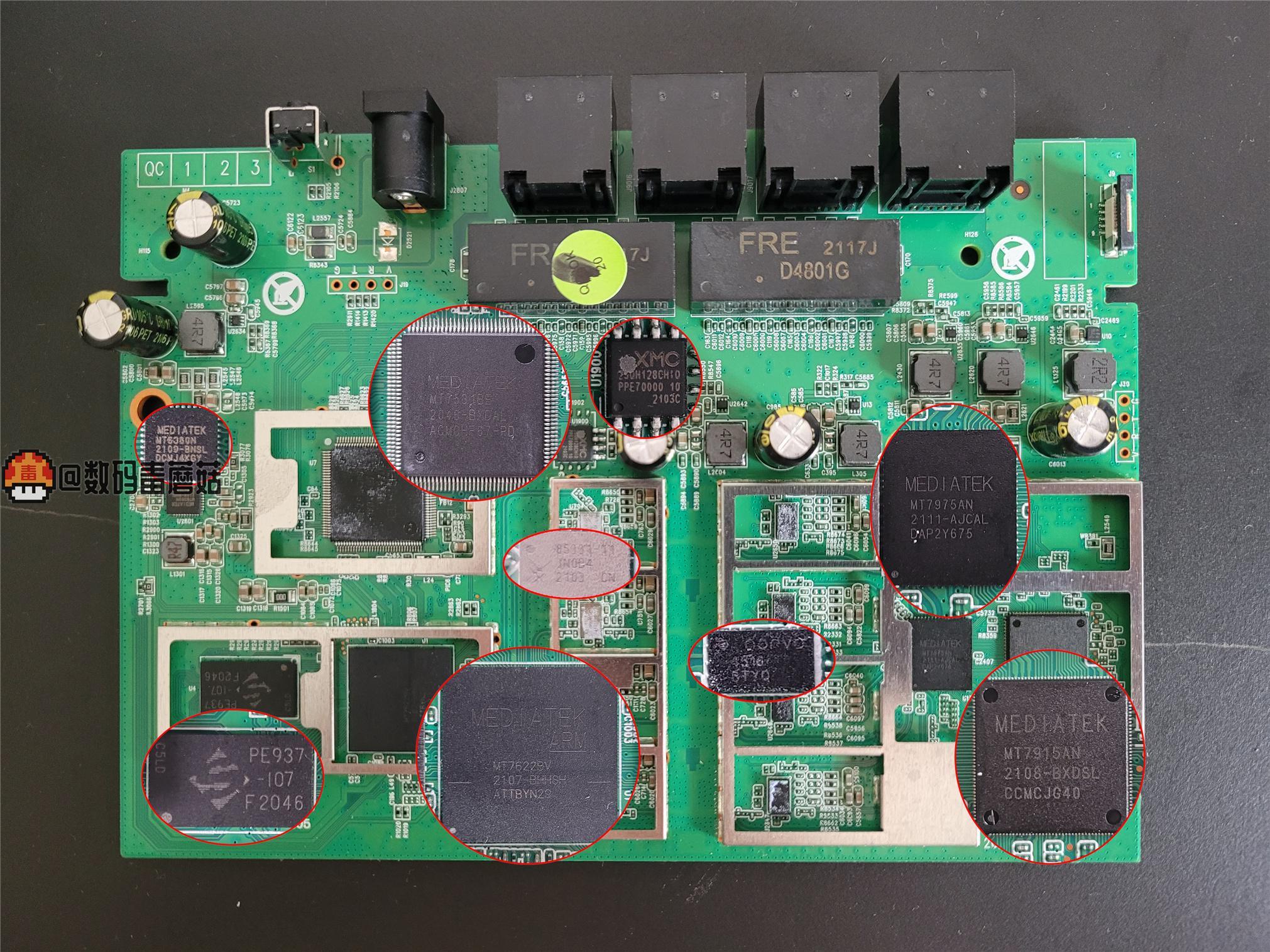 主板上面的所有硬件我给做了个放大,CPU为联发科MT7622BV,是一款ARM A53架构的双核处理器,主频高达1.35G;千兆交换机芯片MT7531BE;电源管理芯片MT6389N。