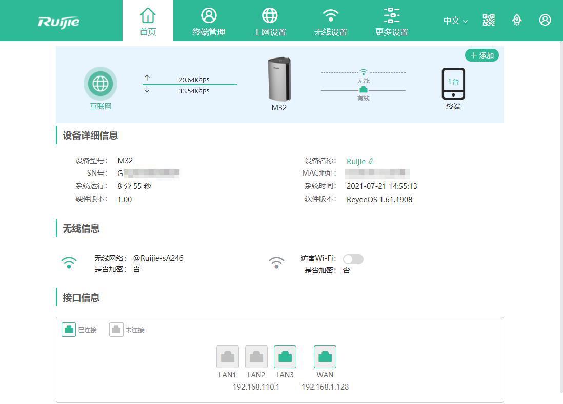 锐捷的设置界面是绿色的,IP地址是192.168.110.1,接上路由器后PC端会自动弹出浏览器设置界面,好评。