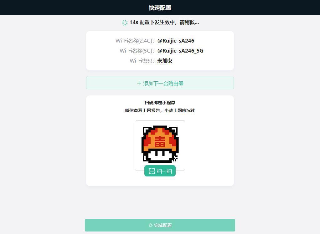 值得夸奖的一个地方是,别家的路由器如果要管理必须下载APP,锐捷路由器可以直接用微信绑定小程序,方便程度大大提高。