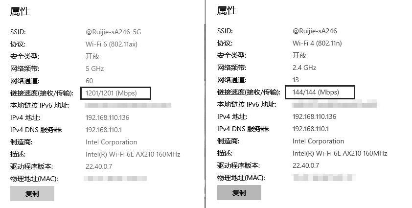 电脑网卡AX210连接锐捷M32后5G/2.4G网速。