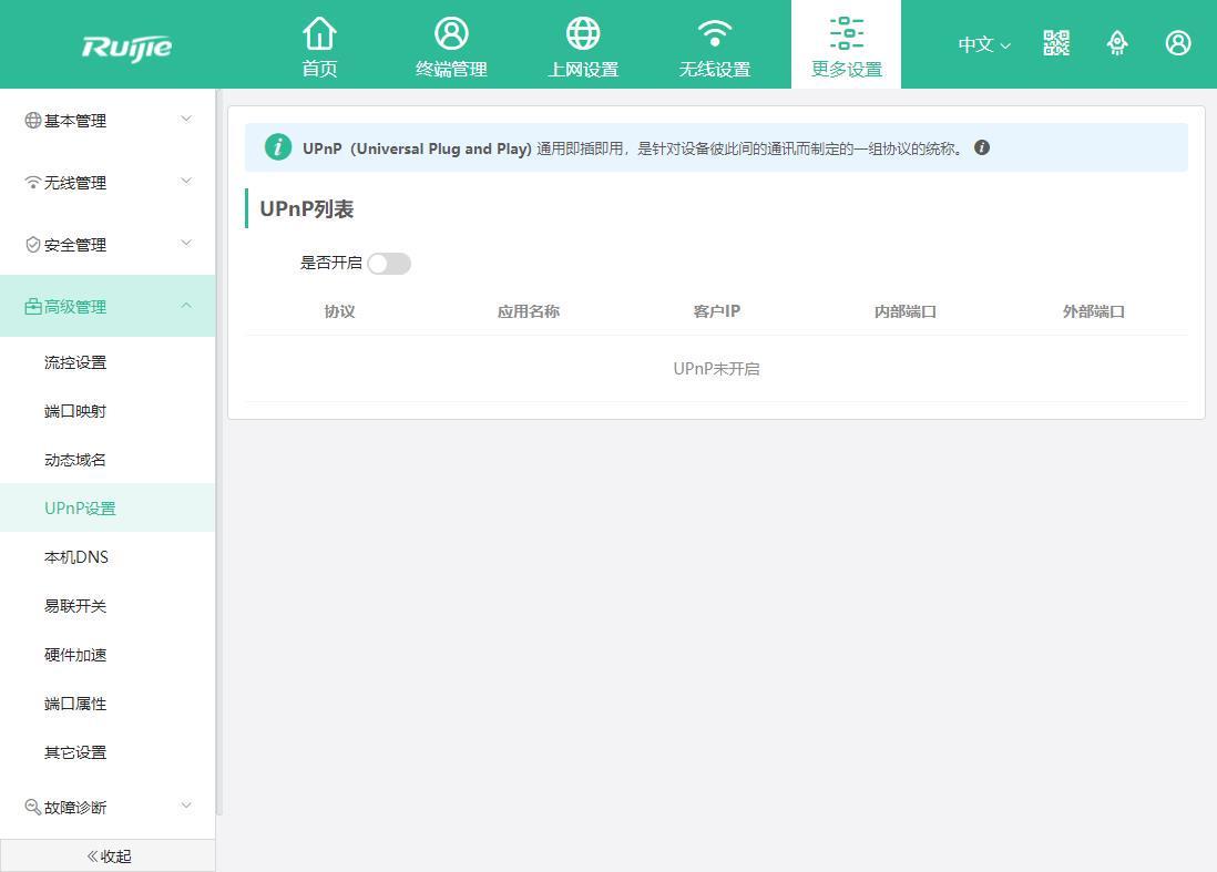 默认状态下是没有打开UPnP的,如果挂有X云和X糖等设备,请自行打开。