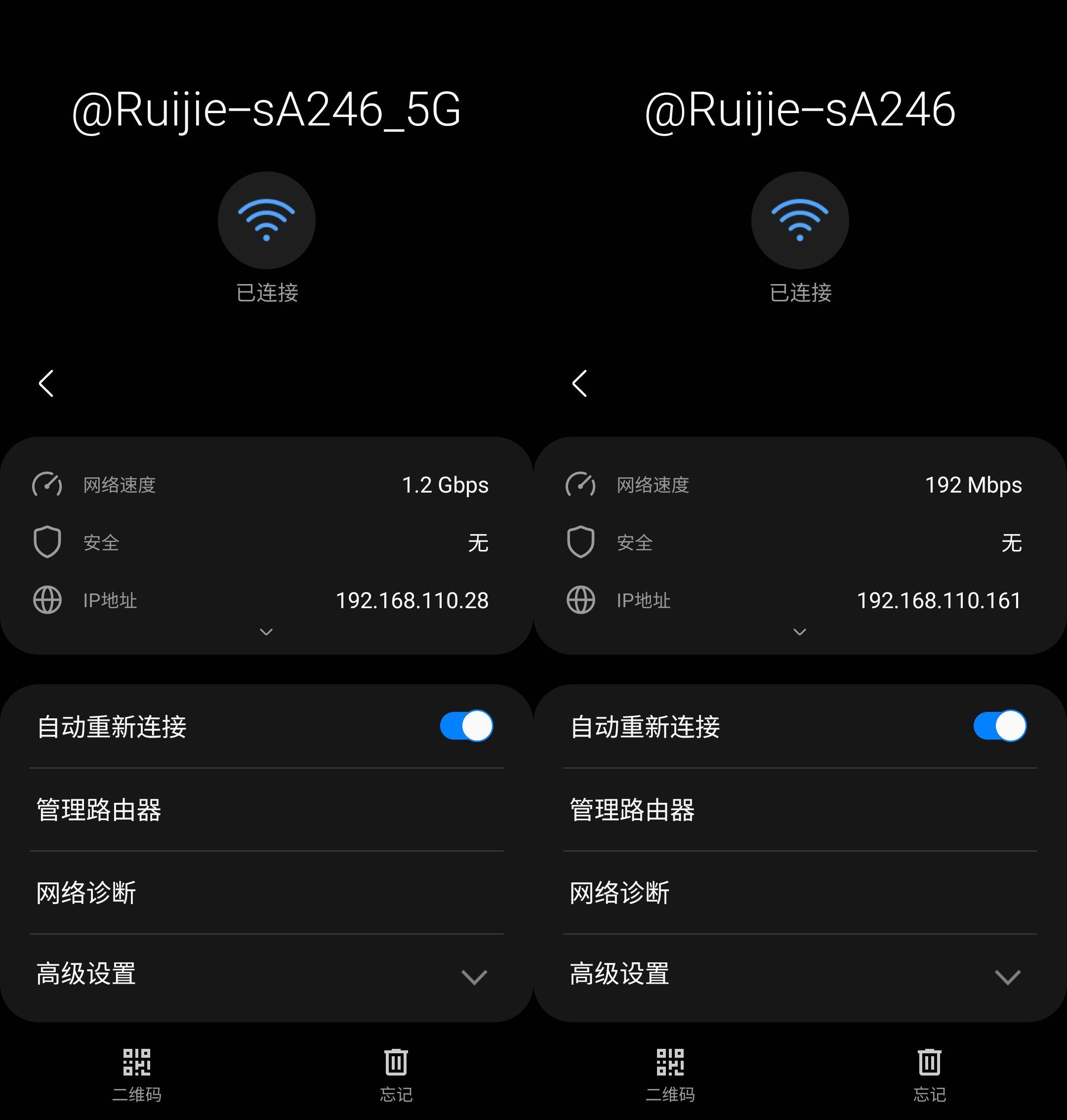 虽然锐捷M32这款路由器在2.4G最高速率800M、5G最高速率2402M,这个数值要么你用同规格的两款锐捷M32跑,要么你买高规无线网卡跑(这个规格的网卡比M32贵,建议买M32),不然很难到这个速率。像手机和平板这种普通家庭设备,一般也就只能跑在5G 1200M(WiFi6)或者5G 867M(WiFi5),而2.4G大多都是192M就算高的了(这也是我只测试5G覆盖不测试2.4G的原因之一),不少低端手机甚至2.4G最高只有87M,部分网络盒子只有60M左右。