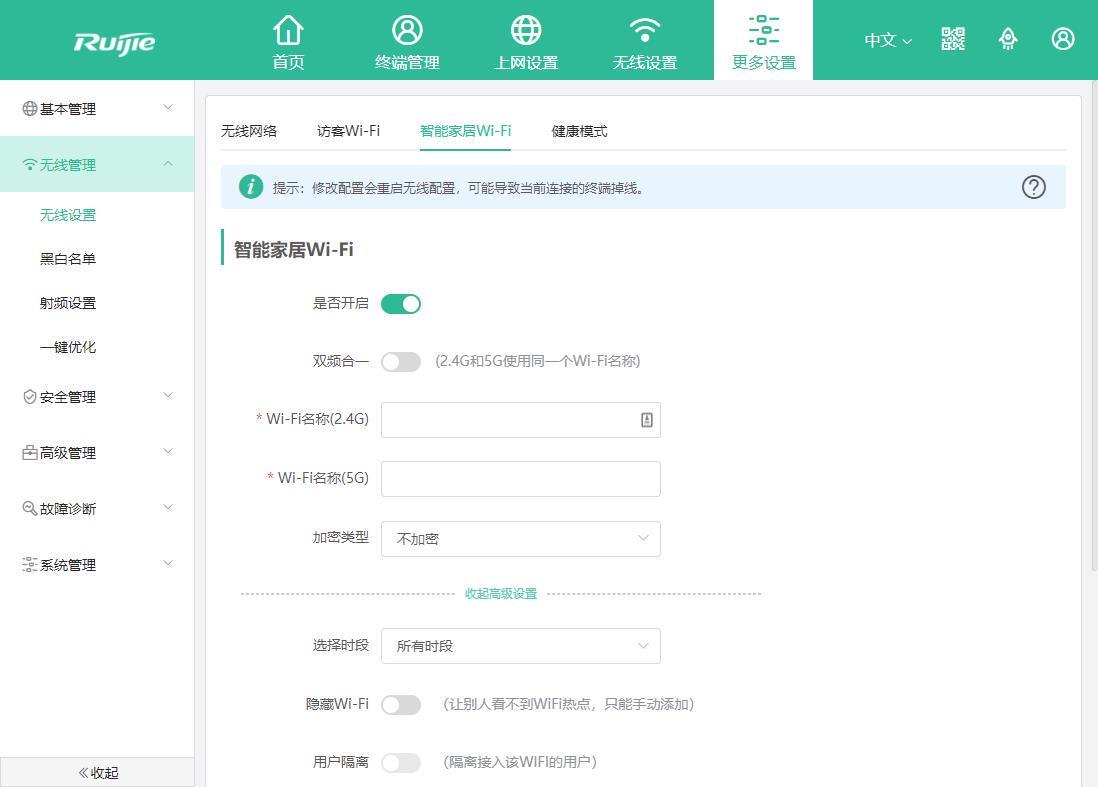 默认没有开启双频合一,然后我忽然发现锐捷这款路由器可以手动选择开启或者关闭WiFi6。我还是第一次遇到可以手动关闭WiFi6的路由器。