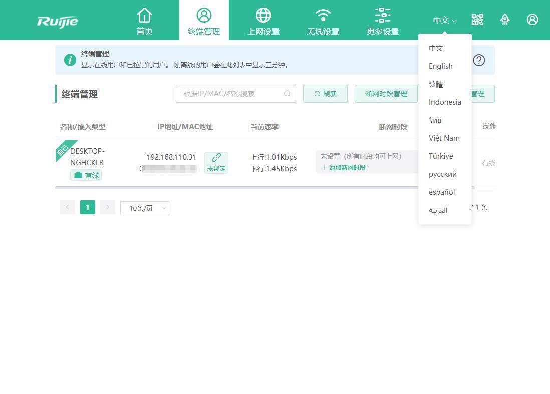 终端管理界面可以设置断网时段,从而达到控制设备上网时间的目的,也可以对联网设备进行拉黑处理。对了,可以设置中英繁体、印尼语和……那啥那啥以及那个啥等六种语言。对语言比较熟悉的朋友帮忙看看,是不是没有日韩?