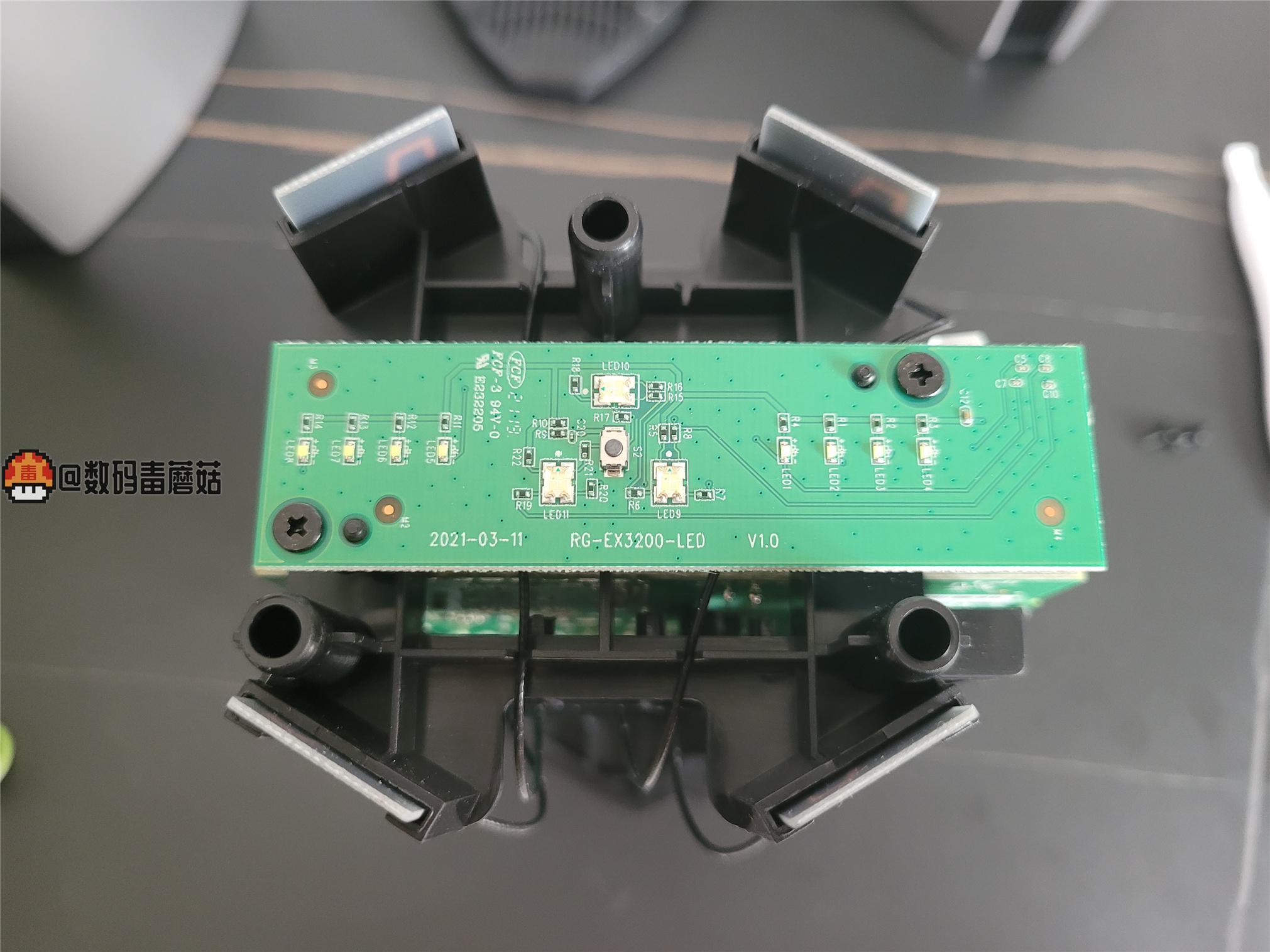 顶部是通过一个排线接出来的Mesh组网键和好几颗灯泡,挨着组网键的三颗灯泡有蓝有红,用来指示网络状态。但是我不知道怎么才能让左右的8颗灯珠亮……