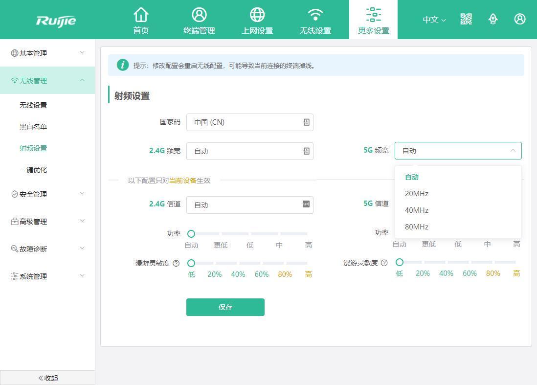 无线设置这里可以调整的选项比较丰富,除了常规的频宽和功率可以调整以外(5G不支持160MHz),也支持漫游灵敏度调整。