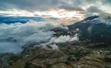 刚过8 点,一阵大风驱散了山间的云雾,远方隐约可以看到树影和屋舍。直到山顶露出光芒,蜿蜒的线条勾勒出梯田的轮廓,平静的水面渐渐泛起金光。从山顶一直到山脚,层层梯田如年轮一般一圈圈地延伸,闪动着粼粼波光,天上地下合为一色,如同进入了一个光的世界。