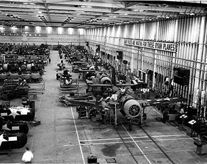 图14. FR-1的组装车间,墙上标语写着“人人恪尽职守,瑞安飞机杀敌”,“很多飞行员都在等着驾驶瑞安飞机”