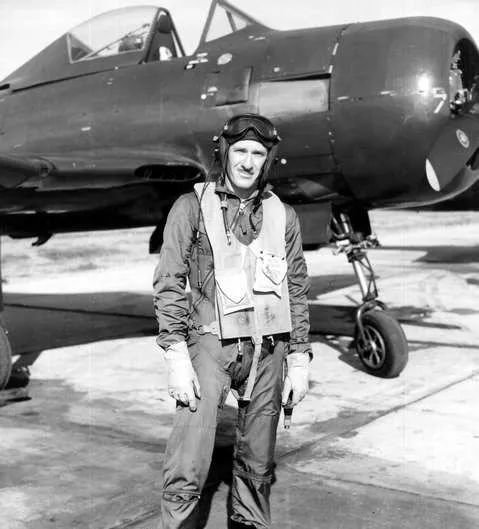 图22. 身着全套飞行装具的约翰·格雷站在FR-1前,格雷因机械事故于1946年6月3日殉职