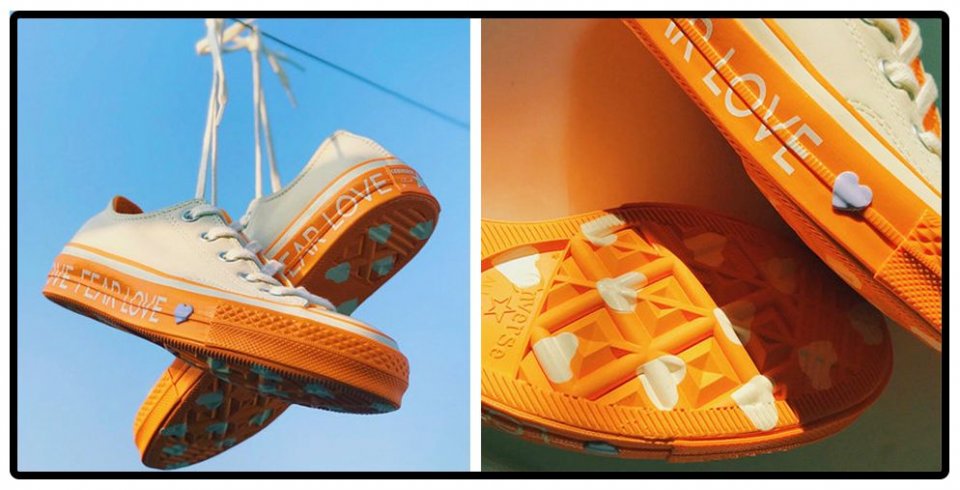 亮点在于鞋底和侧边都有小爱心设计,而且低帮款的边缘还有一圈KEEP FIGHTING和KEEP LOVING的字样。