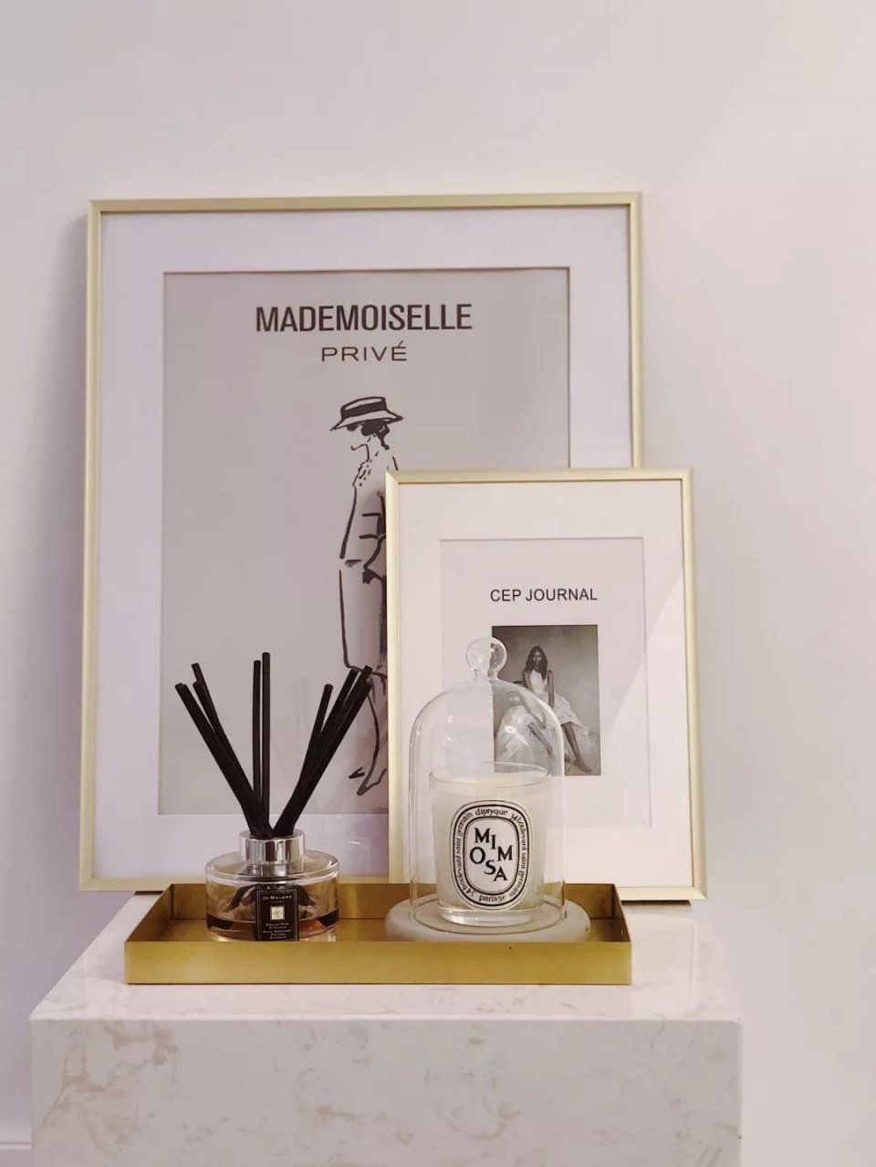 大大的全身镜斜靠着墙面,旁边便是一个香薰台,白色的色调和金属色相搭配,站在全身镜前,或站立或坐着,都能美美的。背后沙发下的奶牛地毯相当吸睛。