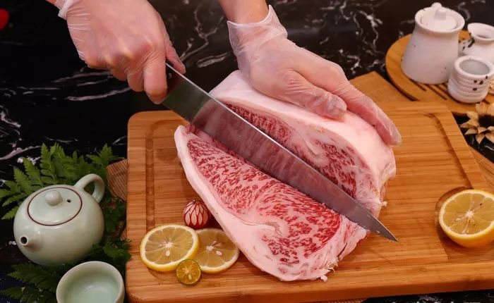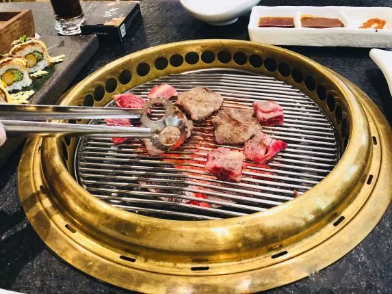 现切和牛日式烧肉,入口即化,哪怕不去蘸任何酱料,直接吃都好吃。雪花肥牛的油脂被炭火烤过之后,溶出的牛肉脂就像牛汤般浓稠,却不显油腻。食之三片,口味适中,酱汁丰富。