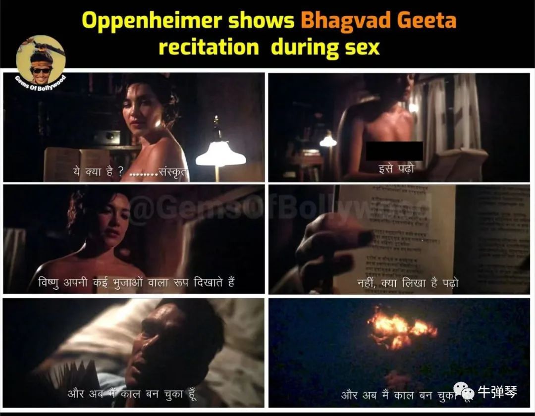 这显现了奥本海默对原子弹的深刻反思。但这样亲密露骨的场景中,引用印度教最神圣的诗文,反正,印度人在电影院里是一边看一边痛骂,一些保守团体,哪怕都没看过这部电影,都纷纷呼吁要抵制。