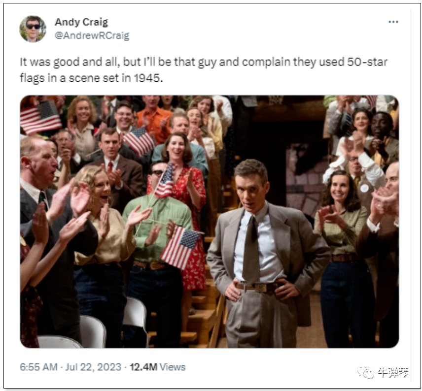 第一个题外话,电影《奥本海默》,据说硬伤不少。除了印度人很愤怒的这一幕激情戏外,还有在1945年的背景人群中,有观众发现,当时挥舞的美国国旗上,居然有50颗星,代表50个州。