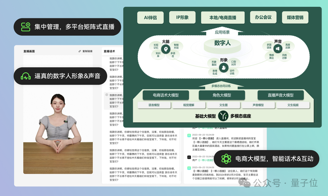 此外,基于以Yi Lightning模型为代表的系列Yi模型,零一万物搭建起了包含角色大模型、直播声音大模型、电商话术大模型在内的一整套专用模型基座,推出了与AI 1.0时代不同的数字人解决方案“如意”。
