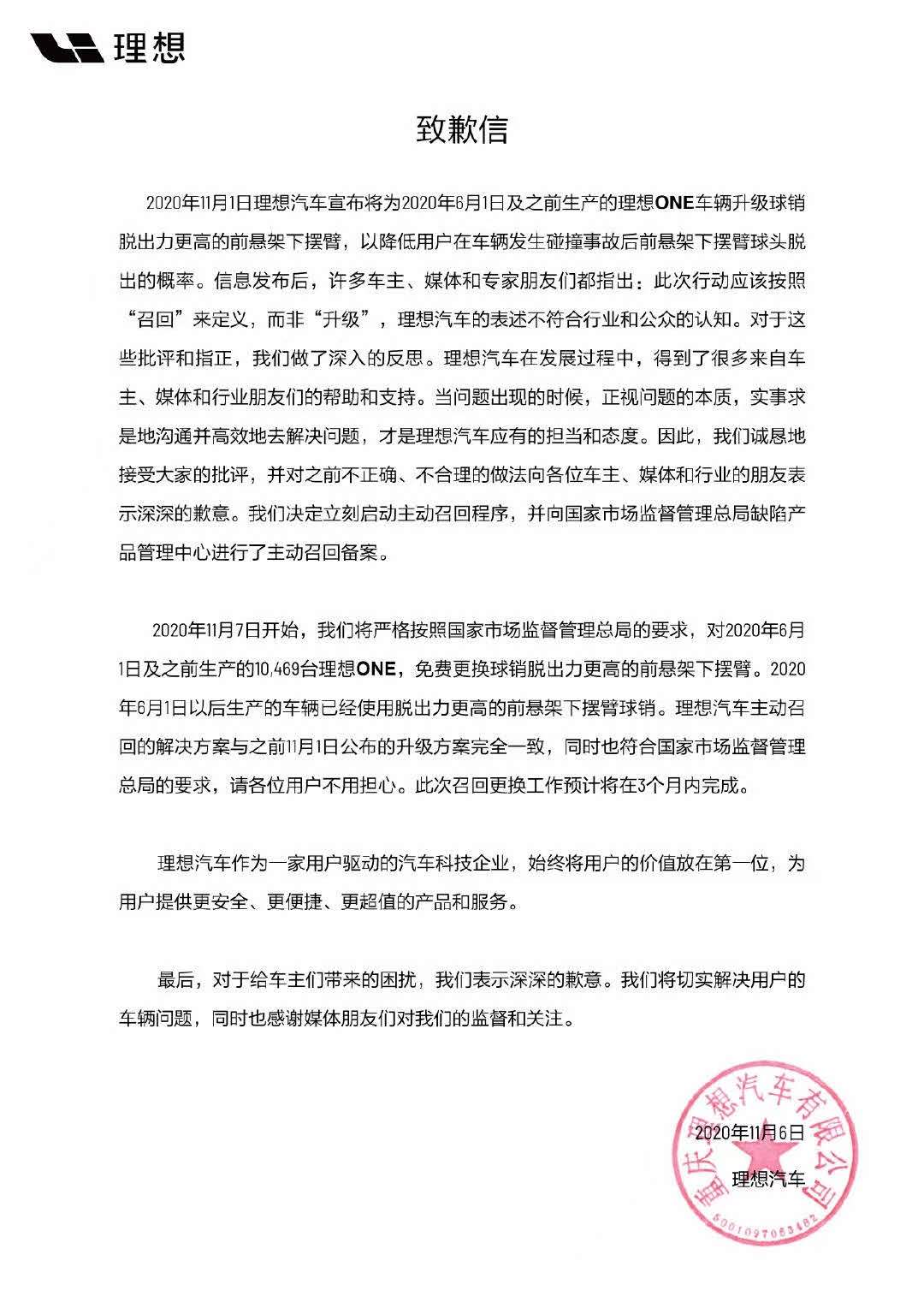 自即日起,召回生产日期在2019年11月14日至2020年6月1日的理想ONE电动汽车,共计10469辆。
