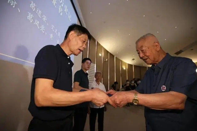 爷爷的儿子葛凤亮从爷爷手中接过“南京大屠杀历史记忆传承人”证书