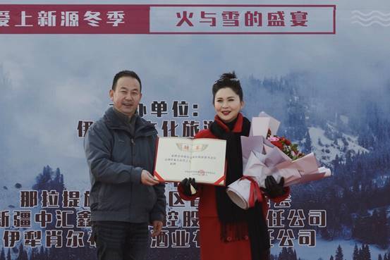那拉提冰雪旅游文化节上,那拉提景区管委会主任史宁同志为田歌老师颁发公益形象代言人聘书。